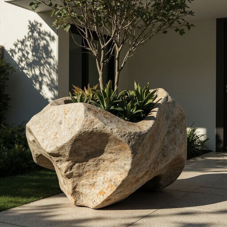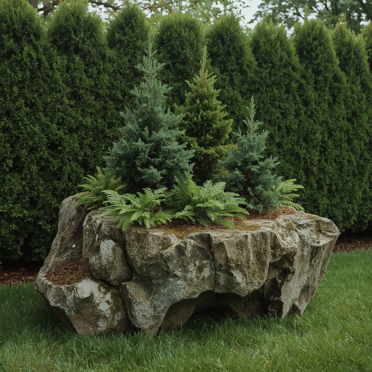 - Клумбы и кашпо: Вазоны в виде большого фрагмента скал и валунов для цветов и хвойных деревьев, декоративных кустарников, сделают клумбу живописной и естественной.